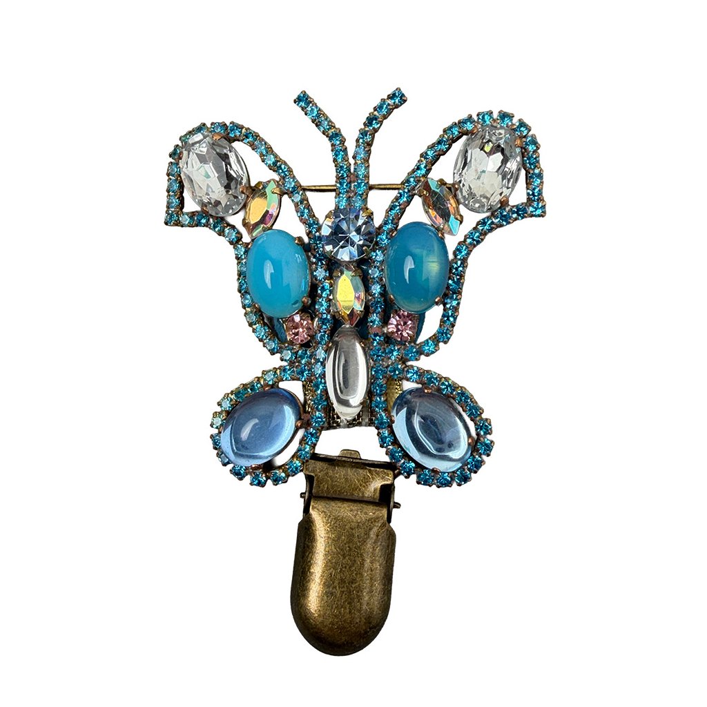 Elegantní brož ve tvaru motýla v retro stylu. Bohatě zdobená šatonovými kameny v krásných barvách. Brož je vytvořena z původních skleněných kamenů tradiční jablonecké výroby, což jí dodává punc starožitnosti.Brož byla dodatečně upravena pro potřeby v kruhu. Lze na ni připevnit výstavní číslo.
