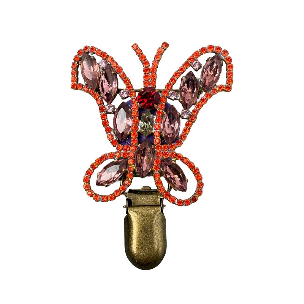 Elegantní brož ve tvaru motýla v retro stylu. Bohatě zdobená šatonovými kameny v krásných barvách. Brož je vytvořena z původních skleněných kamenů tradiční jablonecké výroby, což jí dodává zdání starožitnosti. Lze na ni připevnit výstavní číslo.