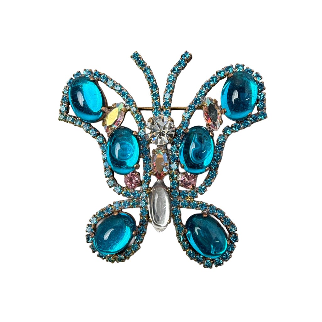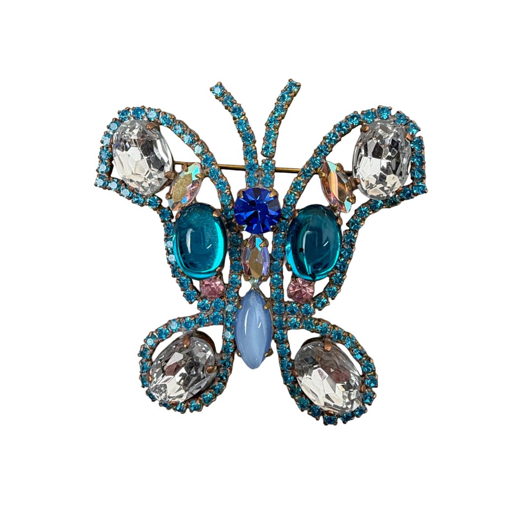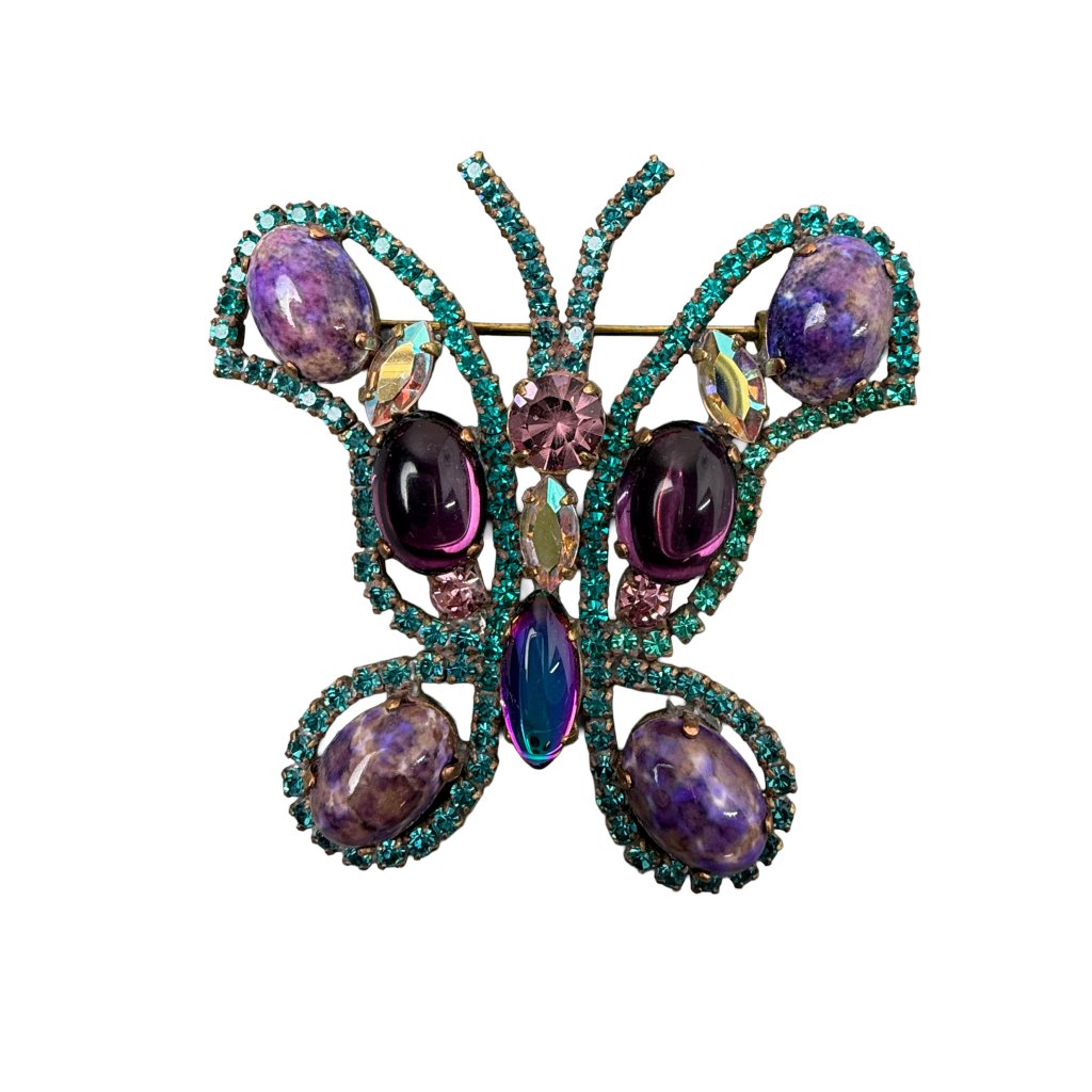 Nová elegantní brož ve tvaru motýla ze současné tvorby. Bohatě zdobená šatonovými kameny v krásných barvách. Brož je vytvořena z původních skleněných kamenů tradiční jablonecké výroby. Jde o profesionální řemeslnou výrobu s kvalitními stejnobarevnými spoji a gavanizací.