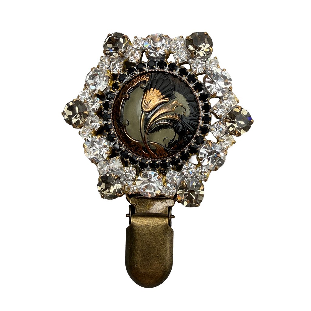 Nová elegantní brož s tulipánovým středem. Brož je vytvořena z původních skleněných kamenů tradiční jablonecké výroby. Jde o profesionální řemeslnou výrobu s barevnou povrchovou úpravou kovu. Z důvodu cenové dostupnosti bez finální povrchové galvanizace. Brož je dodatečně upravena pro potřeby využití v kruhu.