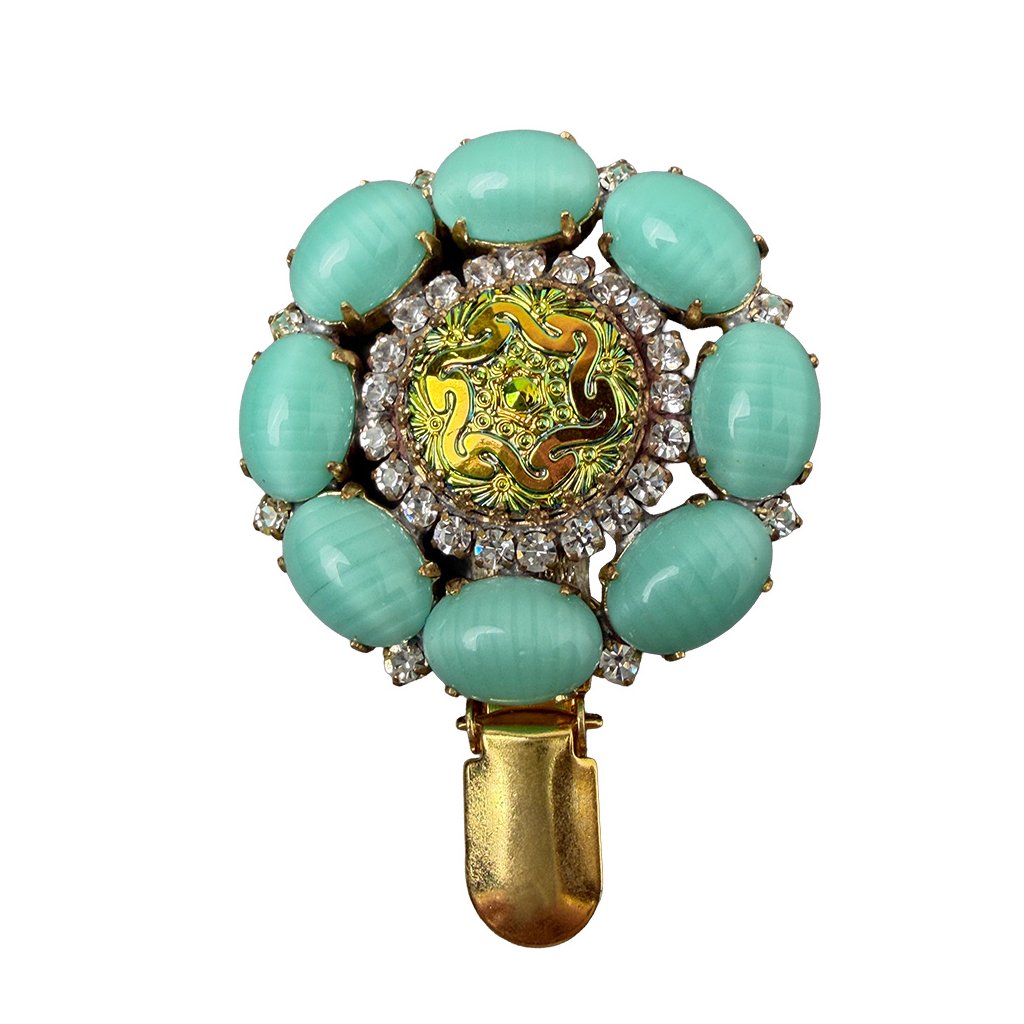 Elegantní brož s hvězdicovitým ornamentem v retro stylu. Brož je vytvořena z původních skleněných kamenů tradiční jablonecké výroby, což jí dodává punc starožitnosti. Brož je dodatečně upravena pro potřeby využití v kruhu. Lze na ni připevnit výstavní číslo.
