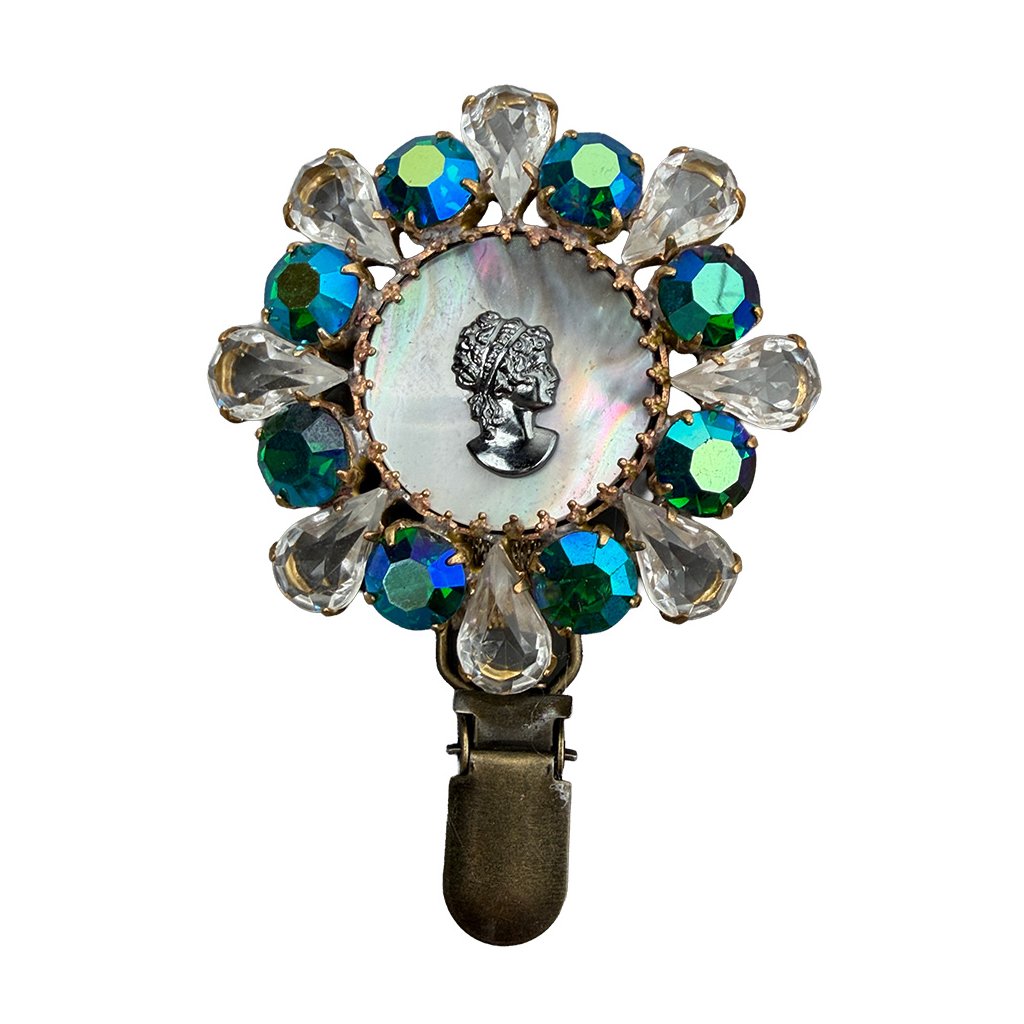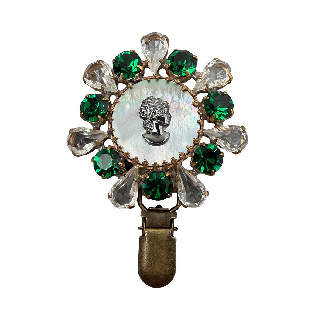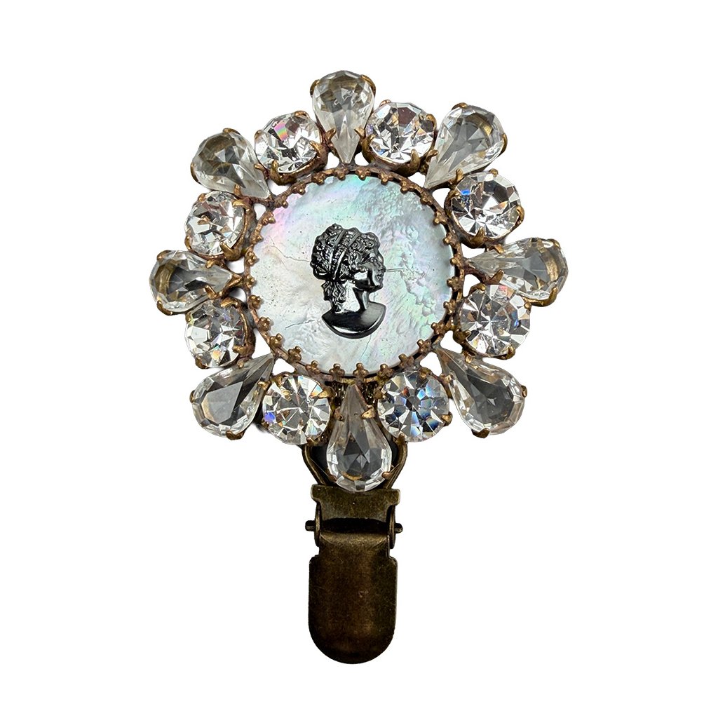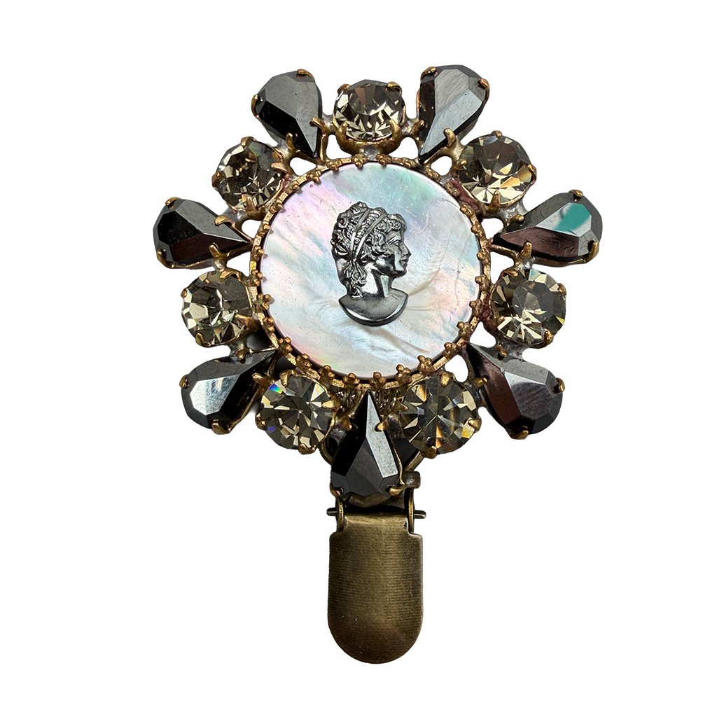 Nová elegantní brož s kamejí a perletí ze současné tvorby. Brož je vytvořena z původních skleněných kamenů tradiční jablonecké výroby. Brož je dodatečně upravena pro potřeby využití v kruhu.