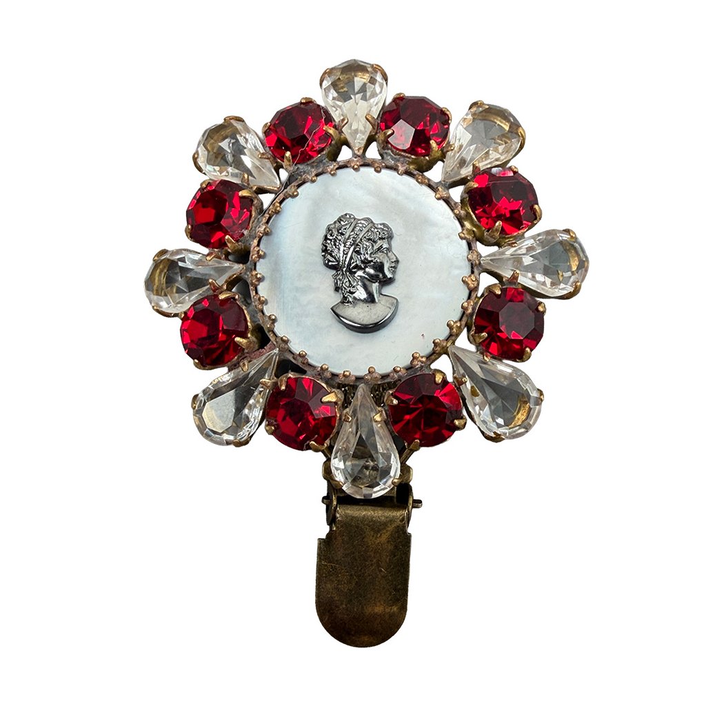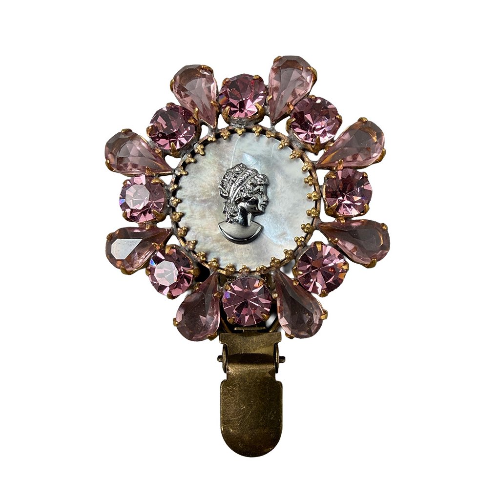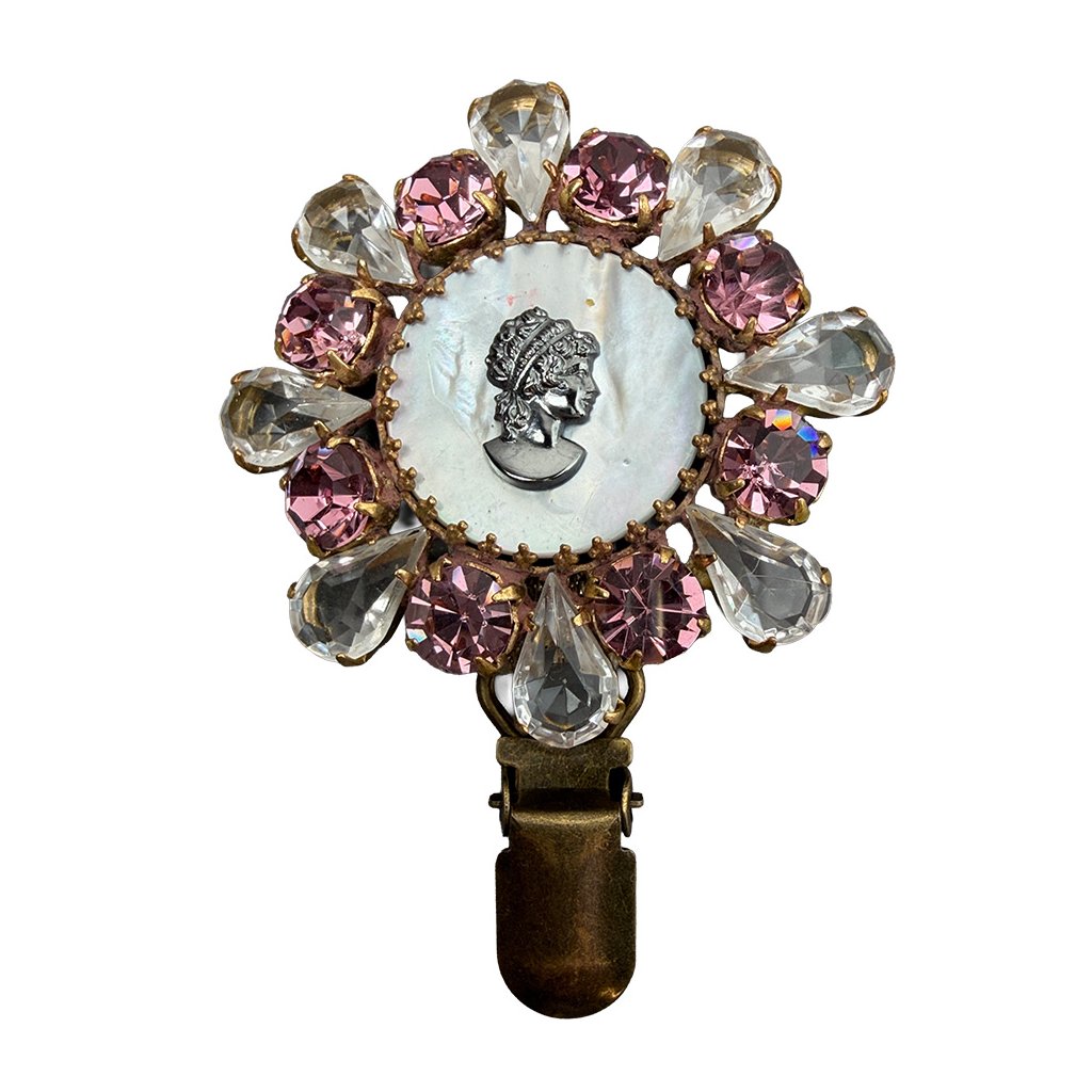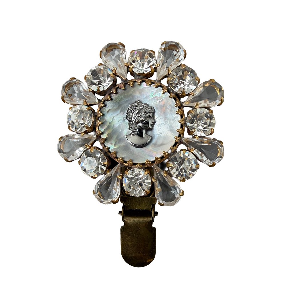 Nová elegantní brož s kamejí a perletí ze současné tvorby. Brož je vytvořena z původních skleněných kamenů tradiční jablonecké výroby. Brož je dodatečně upravena pro potřeby využití v kruhu.