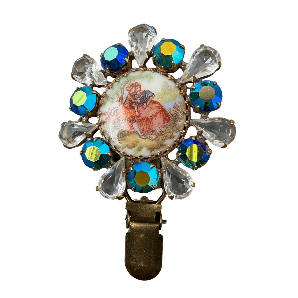 Elegantní brož s pastýřským výjevem in retro style. Brož je vytvořena z původních skleněných kamenů tradiční jablonecké výroby, což jí dodává punc starožitnosti. Brož byla dodatečně upravena pro potřeby v kruhu. Lze na ni připevnit výstavní číslo.