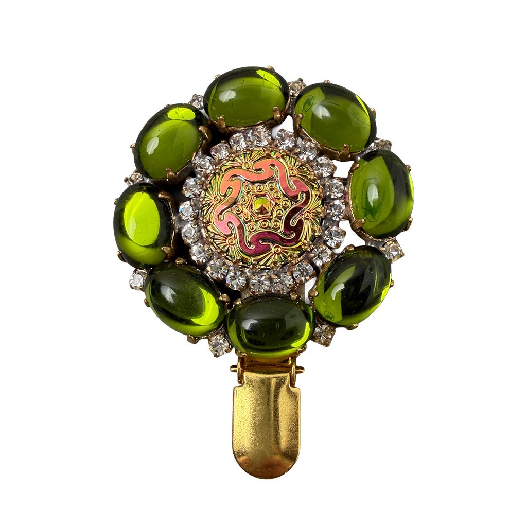 Nová elegantní brož s květinovým středem ze současné tvorby. Brož je vytvořena z původních skleněných kamenů tradiční jablonecké výroby, což jí dodává punc starožitnosti. Brož byla dodatečně upravena pro potřeby v kruhu. Lze na ni připevnit výstavní číslo.