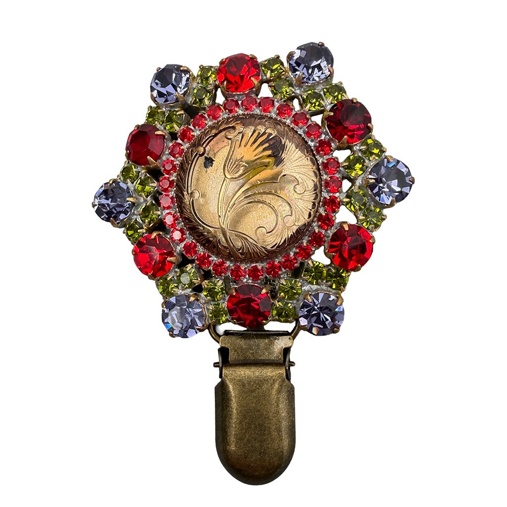 Nová elegantní brož s tulipánovým středem. Brož je vytvořena z původních skleněných kamenů tradiční jablonecké výroby. Jde o profesionální řemeslnou výrobu s barevnou povrchovou úpravou kovu. Z důvodu cenové dostupnosti bez finální povrchové galvanizace. Brož je dodatečně upravena pro potřeby využití v kruhu.