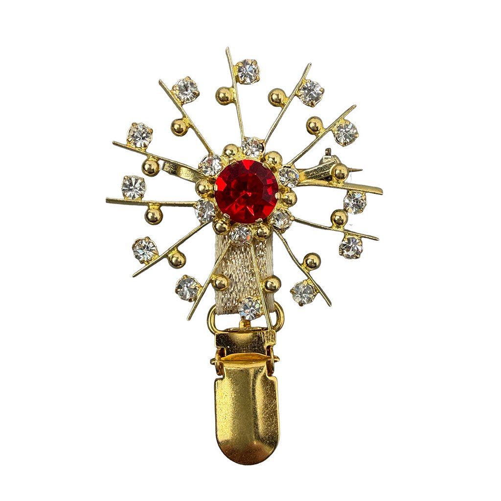 Elegantní brož ve tvaru sluníčka. Brož je vytvořena z původních skleněných kamenů tradiční jablonecké výroby, což jí dodává punc starožitnosti. Brož byla dodatečně upravena pro potřeby v kruhu. Lze na ni připevnit výstavní číslo.