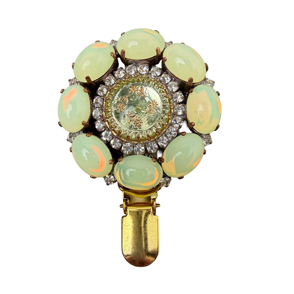Nová elegantní brož s květinovým středem v retro stylu s kameny i středem z uranového skla. Brož je vytvořena z původních skleněných kamenů tradiční jablonecké výroby, což jí dodává punc starožitnosti. Brož byla dodatečně upravena pro potřeby v kruhu. Lze na ni připevnit výstavní číslo.