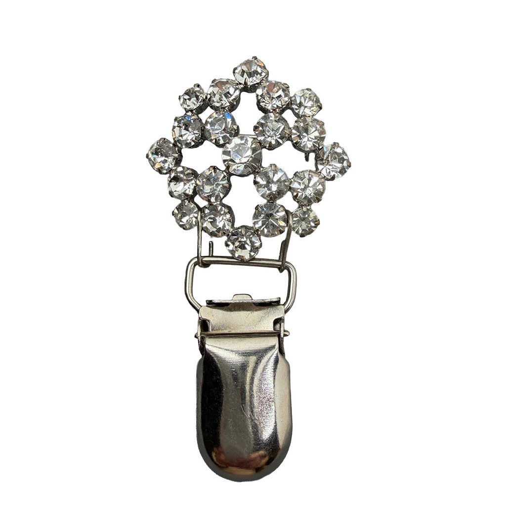 Dobová brož ve tvaru květiny, vytvořená původně ze skla a kovu, šperk je pravděpodobně české výroby,, brož je upravena pro potřeby ve výstavním kruhu.