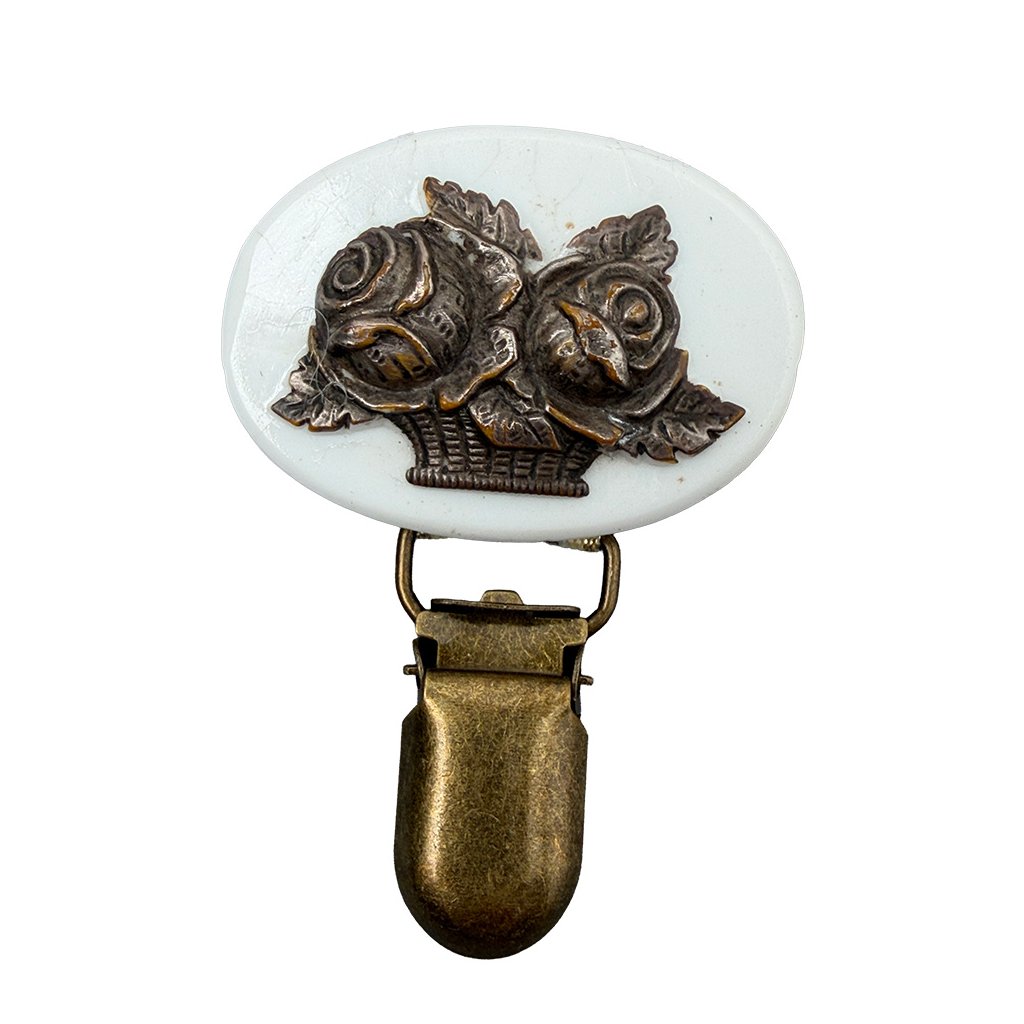 Dobová brož s kamejí košíku růží vytvořená původně ze skla a kovu, brož je upravena pro potřeby ve výstavním kruhu.