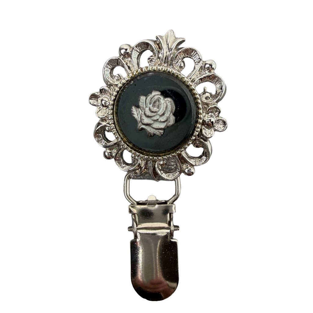 Dobová brož s kamejí růže vytvořená původně ze skla a kovu, šperk je české tradiční výroby, původem přímo z Jablonecka, brož je upravena pro potřeby ve výstavním kruhu.