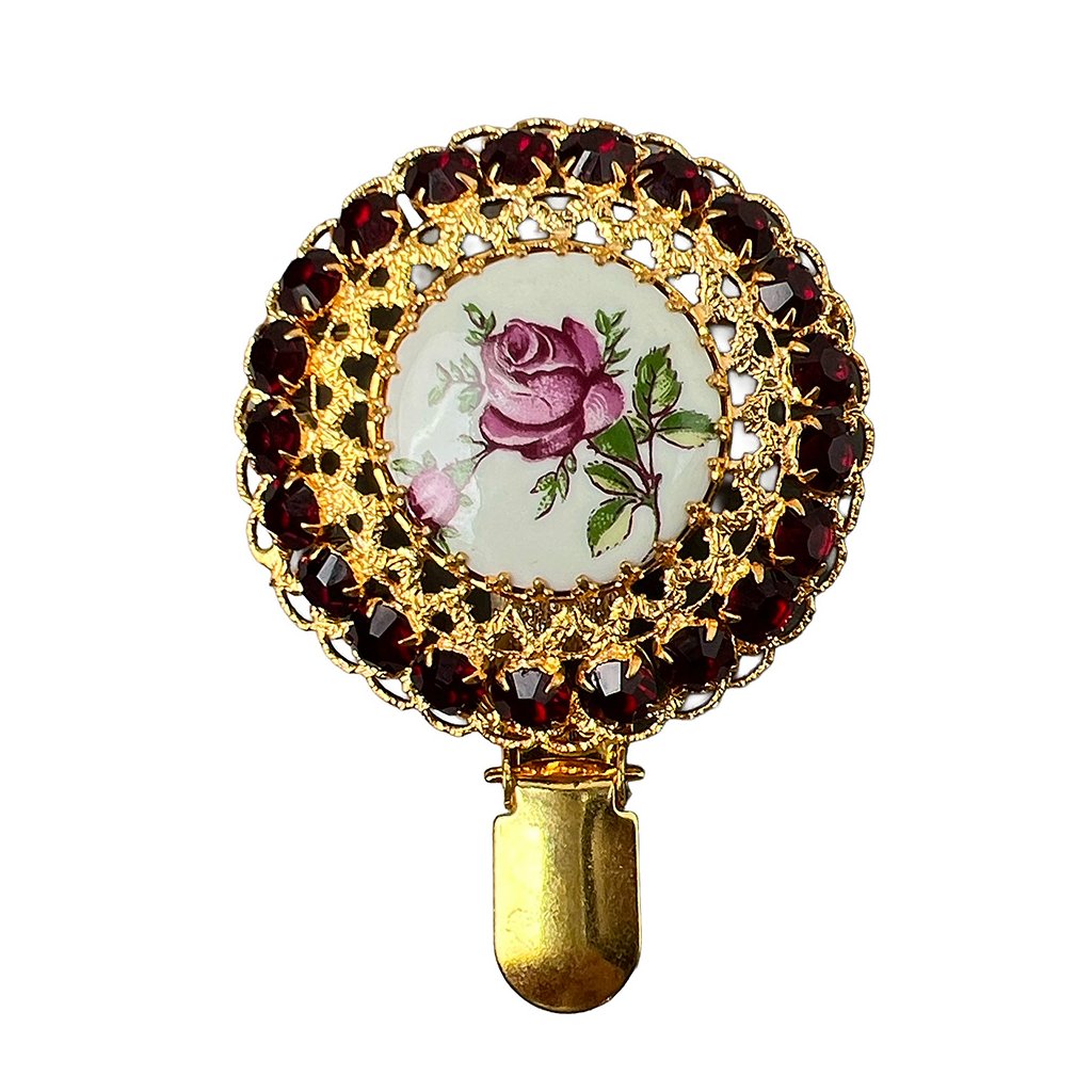 Dobová brož s porcelánovým kabošonem a s kamínky granátového skla, vytvořená původně ze skla a kovu, šperk je české tradiční výroby, původem přímo z Jablonecka, brož je upravena pro potřeby ve výstavním kruhu.