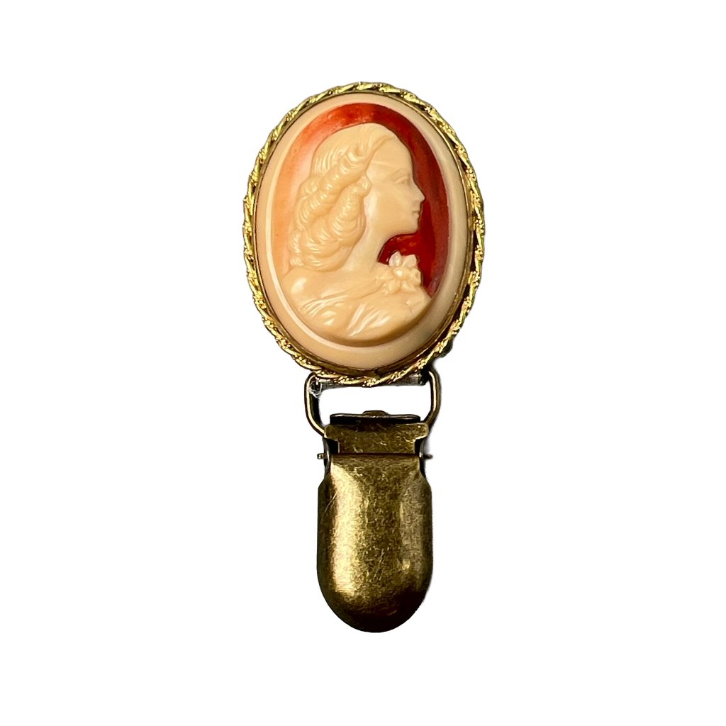 Dobová brož s kamejí dívky vytvořená původně ze skla a kovu, šperk je české tradiční výroby, původem přímo z Jablonecka, brož je upravena pro potřeby ve výstavním kruhu.