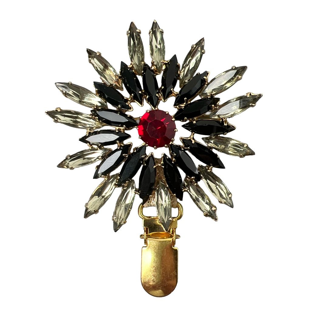 Dobová brož ve tvaru květiny, vytvořená původně ze skla a kovu, šperk je české tradiční výroby, původem přímo z Jablonecka, brož je upravena pro potřeby ve výstavním kruhu.