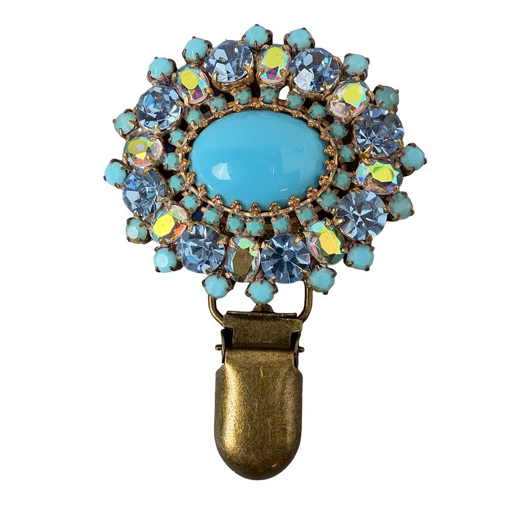 Elegant brooch with an oval cabochon in retro style. The brooch is made from original glass stones, traditionally produced in Jablonec, which give it an antique look. The brooch has been additionally modified for use in a dog show ring. An exhibition number can be attached to it.
