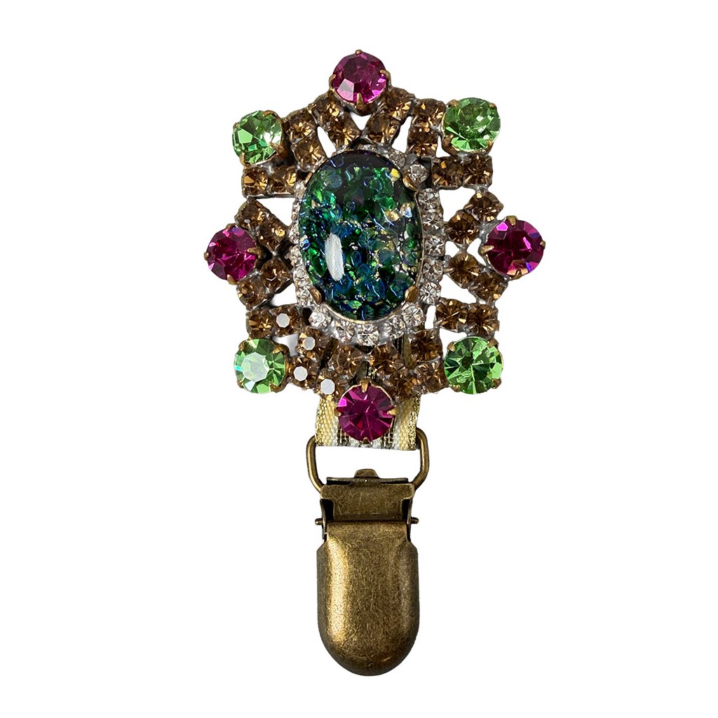 Elegant brooch with an oval cabochon in retro style. The brooch is made from original glass stones traditionally produced in Jablonec, which give it an antique look. The brooch has been additionally modified for use in a dog show ring. An exhibition number can be attached to it.