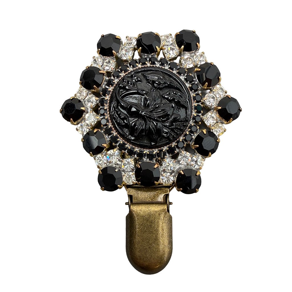 A new, elegant brooch with a floral motif. The brooch is made from original glass stones traditionally produced in Jablonec. It is a professional, handcrafted product with a colored metal finish. For cost reasons, it does not have a final galvanised finish. The brooch has been additionally modified for use in a dog show ring.
