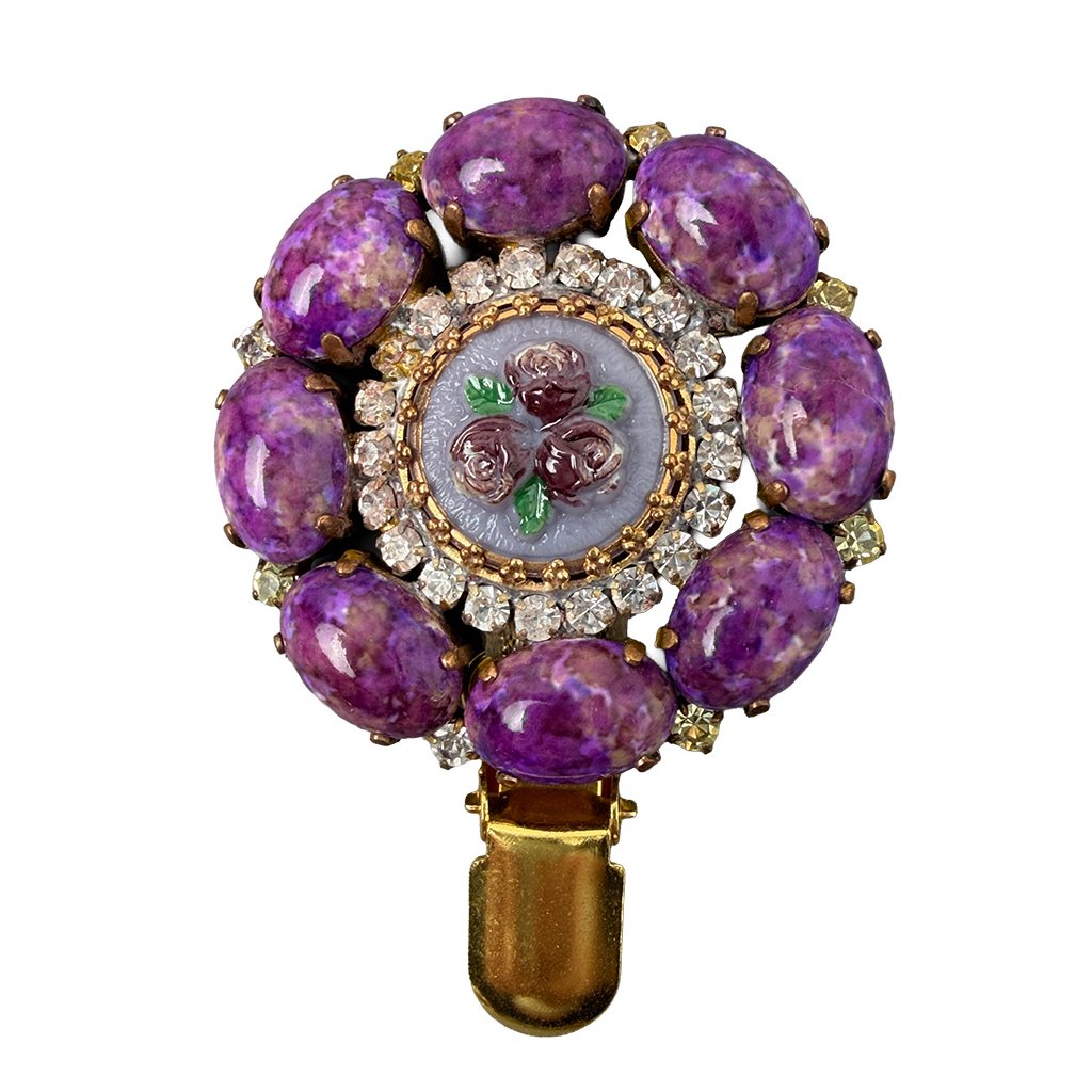 A new, elegant brooch with a floral centre from contemporary design. The brooch is made from original glass stones traditionally produced in Jablonec. The brooch has been additionally modified for use in a dog show ring. An exhibition number can be attached to it.