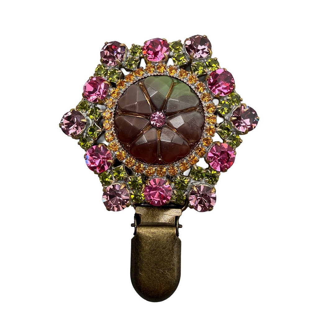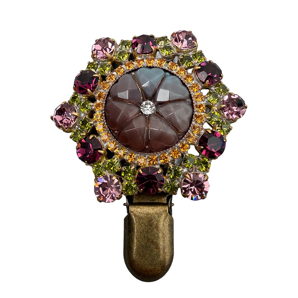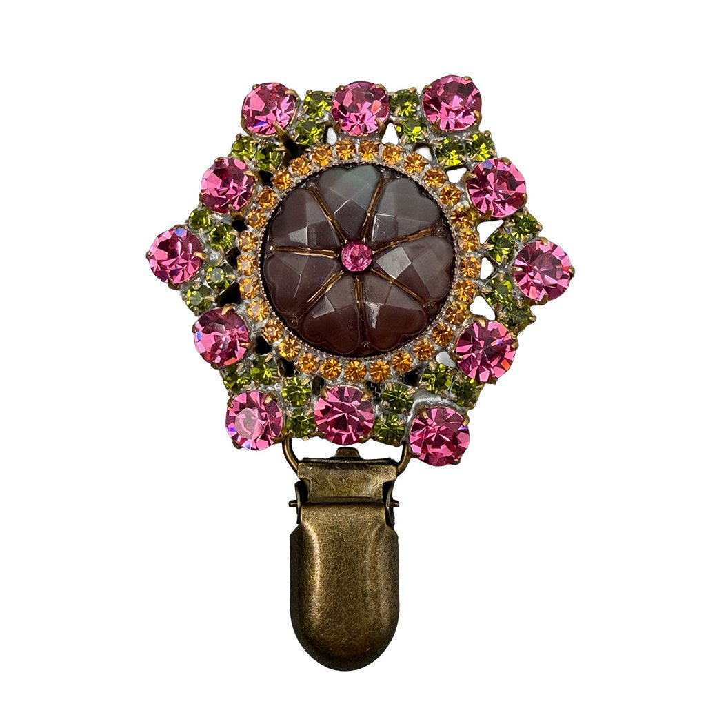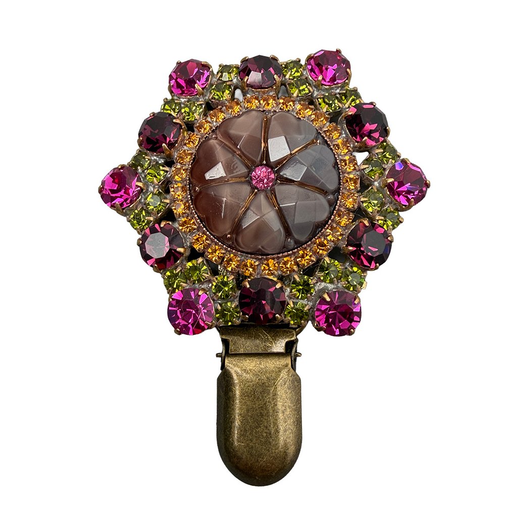 Elegant brooch with a floral seven-leaf clover in retro style. The brooch is made from original glass stones traditionally produced in Jablonec, which give it an antique look. The brooch has been additionally modified for use in a dog show ring. An exhibition number can be attached to it.