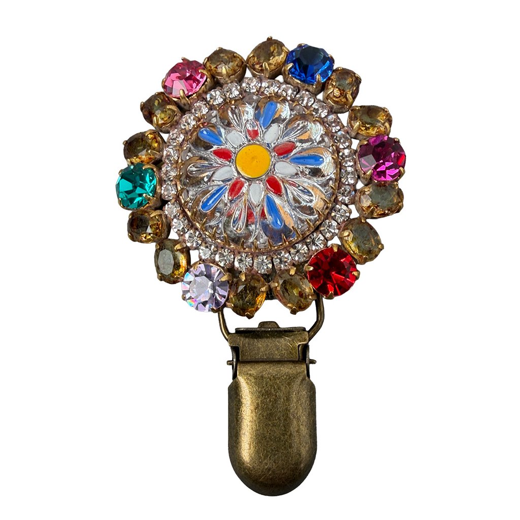Elegant brooch with a colourful flower made in retro style. The brooch is made from original glass stones traditionally produced in Jablonec, which give it an antique look. The brooch has been additionally modified for use in a dog show ring. An exhibition number can be attached to it.