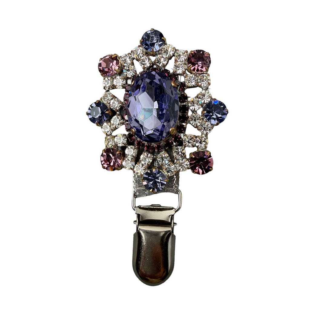Elegant brooch with an oval cabochon in retro style. The brooch is made from original glass stones, traditionally produced in Jablonec, which give it an antique look. The brooch has been additionally modified for use in a dog show ring. An exhibition number can be attached to it.