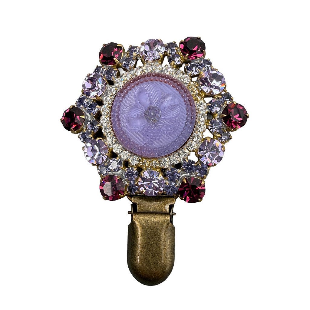 A new, elegant brooch with a floral four-leaf clover. The brooch is made from original glass stones traditionally produced in Jablonec. It is a professional, handcrafted product with a colored metal finish. For cost reasons, it does not have a final galvanised finish. The brooch has been additionally modified for use in a dog show ring.