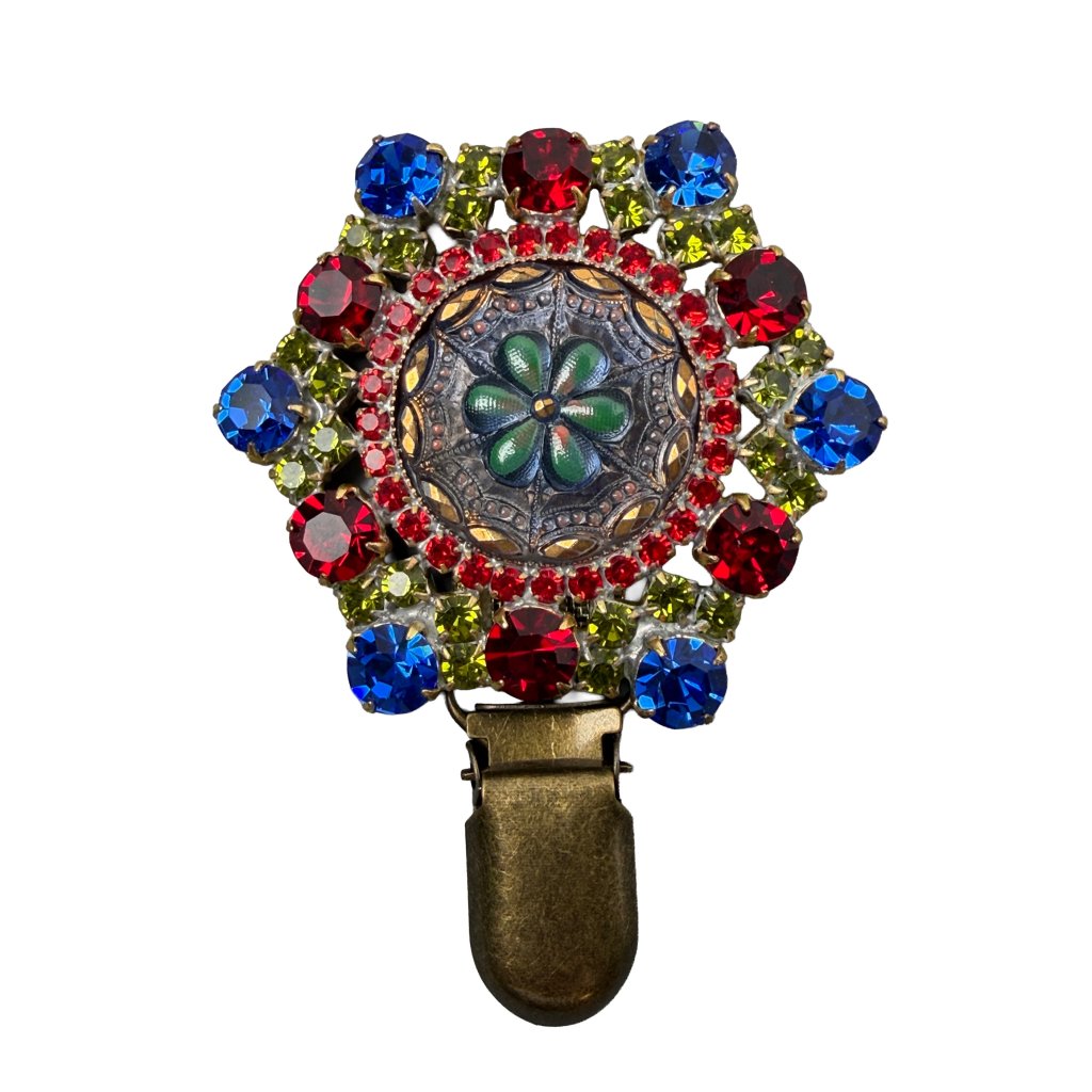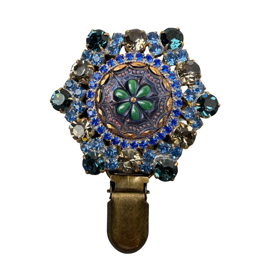 A new, elegant brooch with a flower motif at the centre. The brooch is made from original glass stones traditionally produced in Jablonec. It is a professional, handcrafted product with a colored metal finish. For cost reasons, it does not have a final galvanised finish. The brooch has been additionally modified for use in a dog show ring.