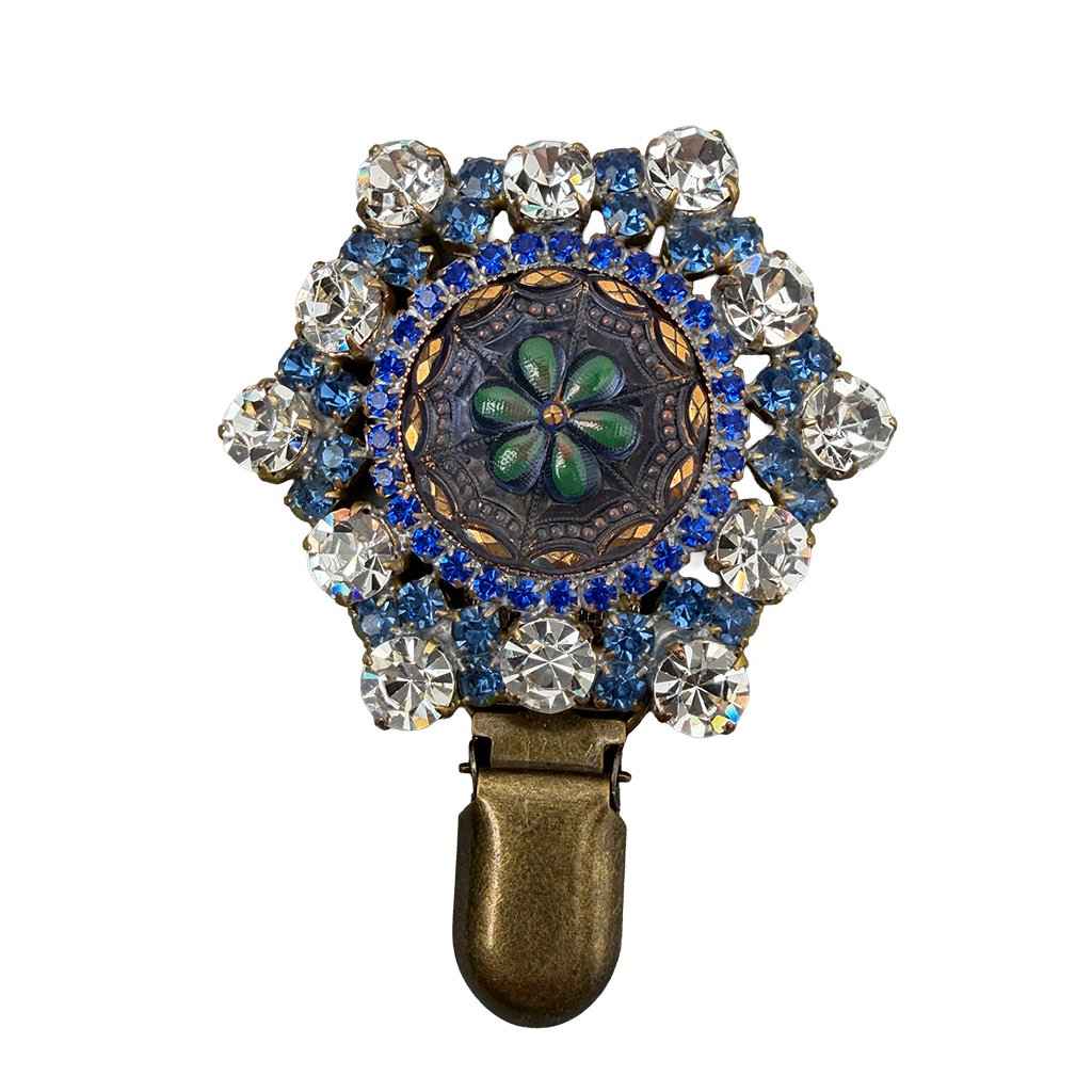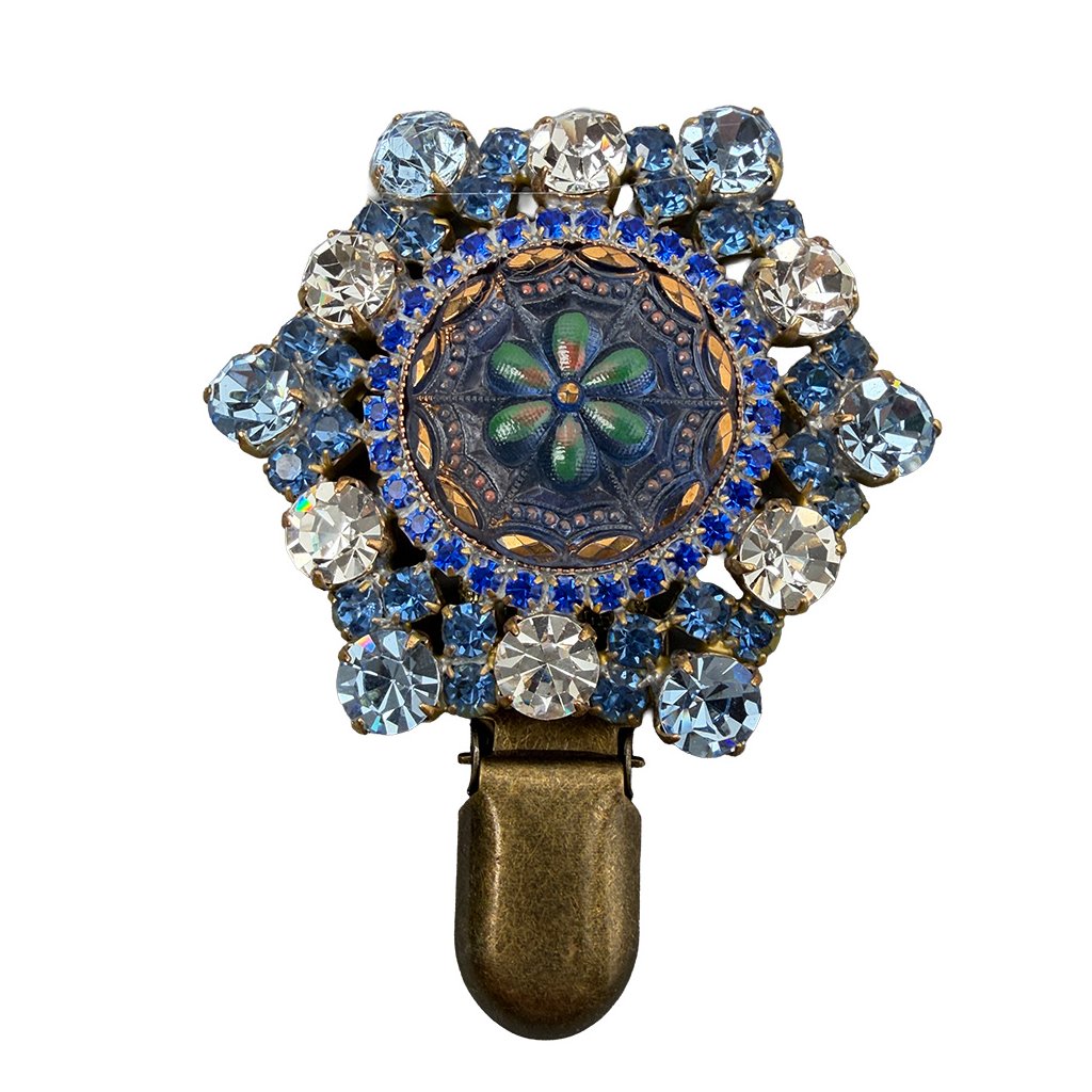 Elegant brooch with a flower motif at the centre in retro style. The brooch is made from original glass stones traditionally produced in Jablonec. The brooch has been additionally modified for use in a dog show ring. An exhibition number can be attached to it.