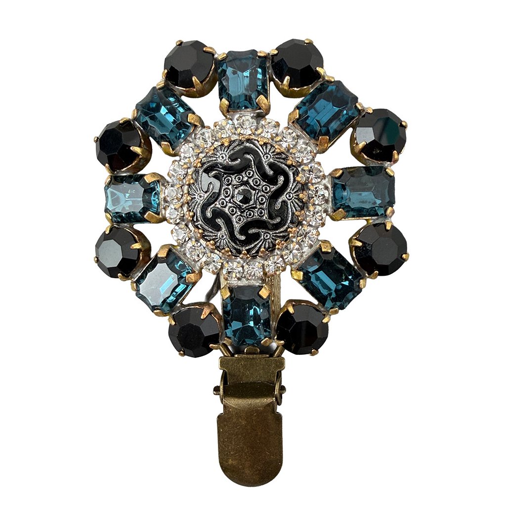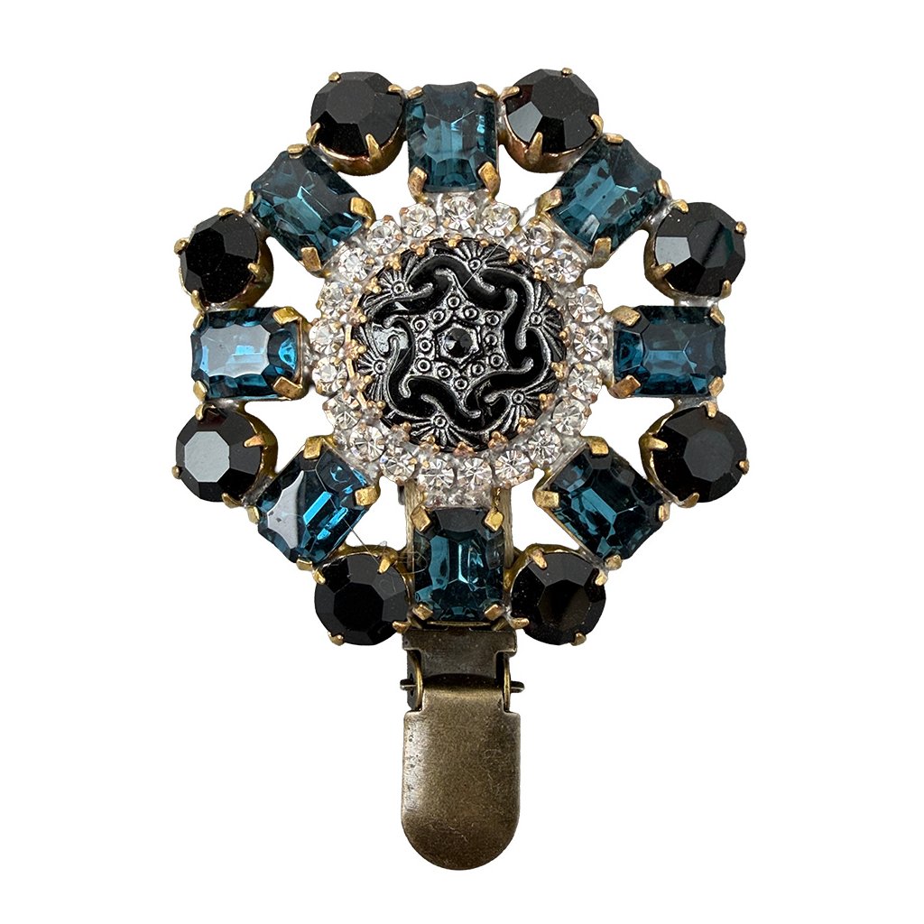 Elegant brooch with a star-shaped ornament in retro style. The brooch is made from original glass stones traditionally produced in Jablonec, which give it an antique look. The brooch has been additionally modified for use in a dog show ring. An exhibition number can be attached to it.