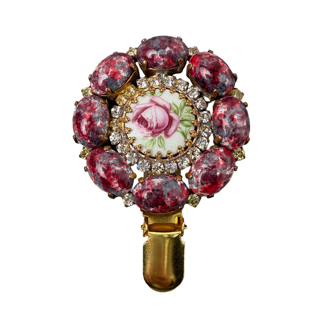 Elegant brooch with a floral centre in retro style. The brooch is made from original glass stones traditionally produced in Jablonec, which give it an antique look. The brooch has been additionally modified for use in a dog show ring. An exhibition number can be attached to it.