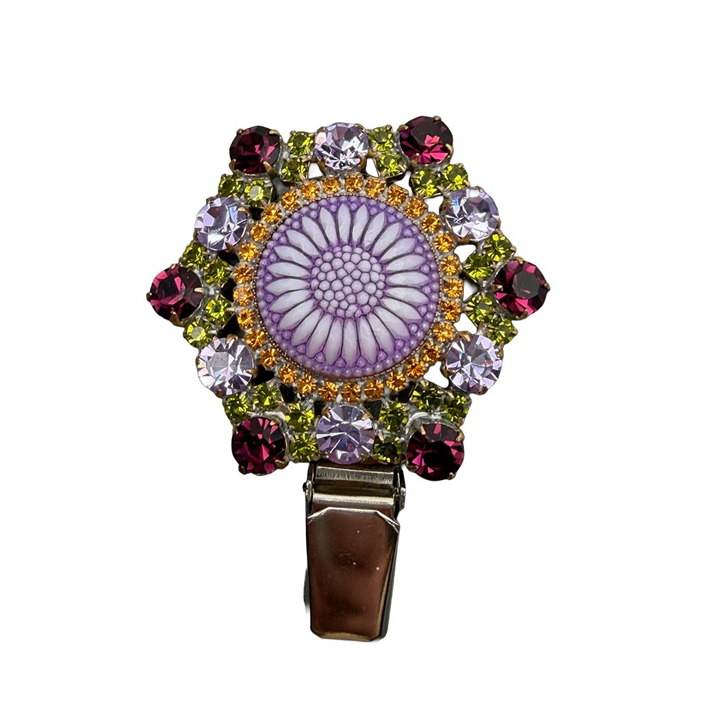 A new, elegant brooch with a sunflower motif at the centre. The brooch is made from original glass stones traditionally produced in Jablonec. It is a professional, handcrafted product with a colored metal finish. For cost reasons, it does not have a final galvanised finish. The brooch has been additionally modified for use in a dog show ring.
