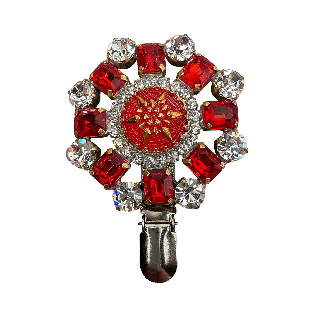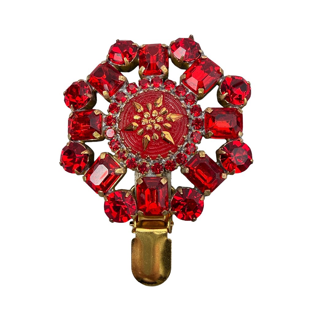 Elegant brooch with a star-shaped centre in retro style. The brooch is made from original glass stones, traditionally produced in Jablonec, which give it an antique look. The brooch has been additionally modified for use in a dog show ring. An exhibition number can be attached to it.