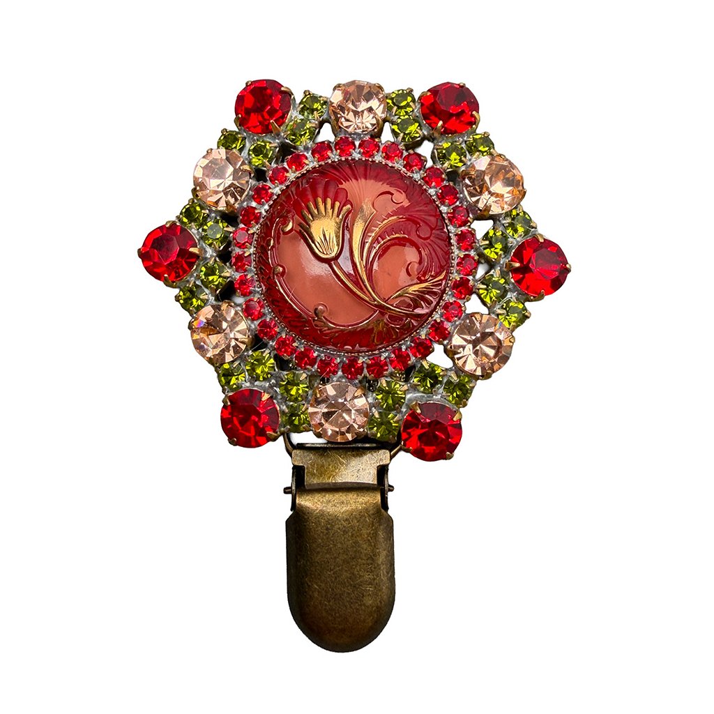 A new, elegant brooch with a tulip motif at the centre. The brooch is made from original glass stones traditionally produced in Jablonec. It is a professional, handcrafted product with a colored metal finish. For cost reasons, it does not have a final galvanised finish. The brooch has been additionally modified for use in a dog show ring.
