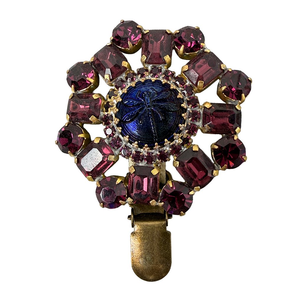 Elegant brooch with a dragonfly made in retro style. The brooch is made from original glass stones traditionally produced in Jablonec, which give it an antique look. The brooch has been additionally modified for use in a dog show ring. An exhibition number can be attached to it.