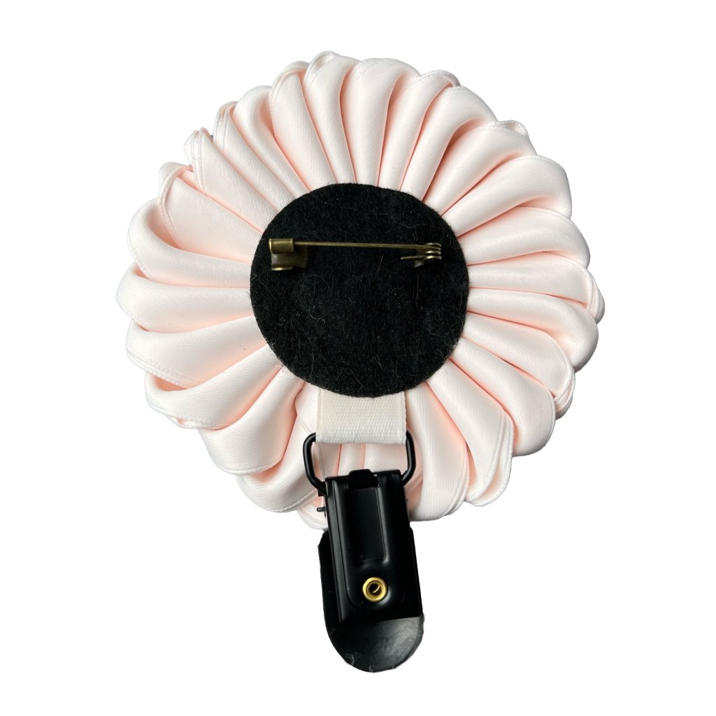 An elegant hand-sewn satin double-layer ribbon brooch with a rhinestone multicoulour decoration and a suspenser clip are used for the number. Fastening on brooch pin at the back.