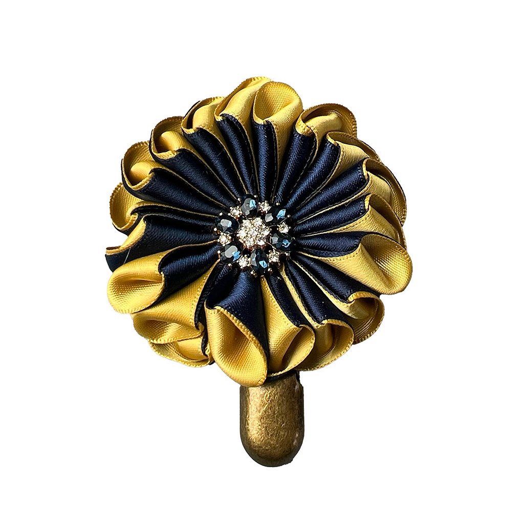 Elegant hand-sewn satin double-layer ribbon brooch with an Ink blue rhinestone button and suspenser clip for number. Fastening on a brooch pin at the back.