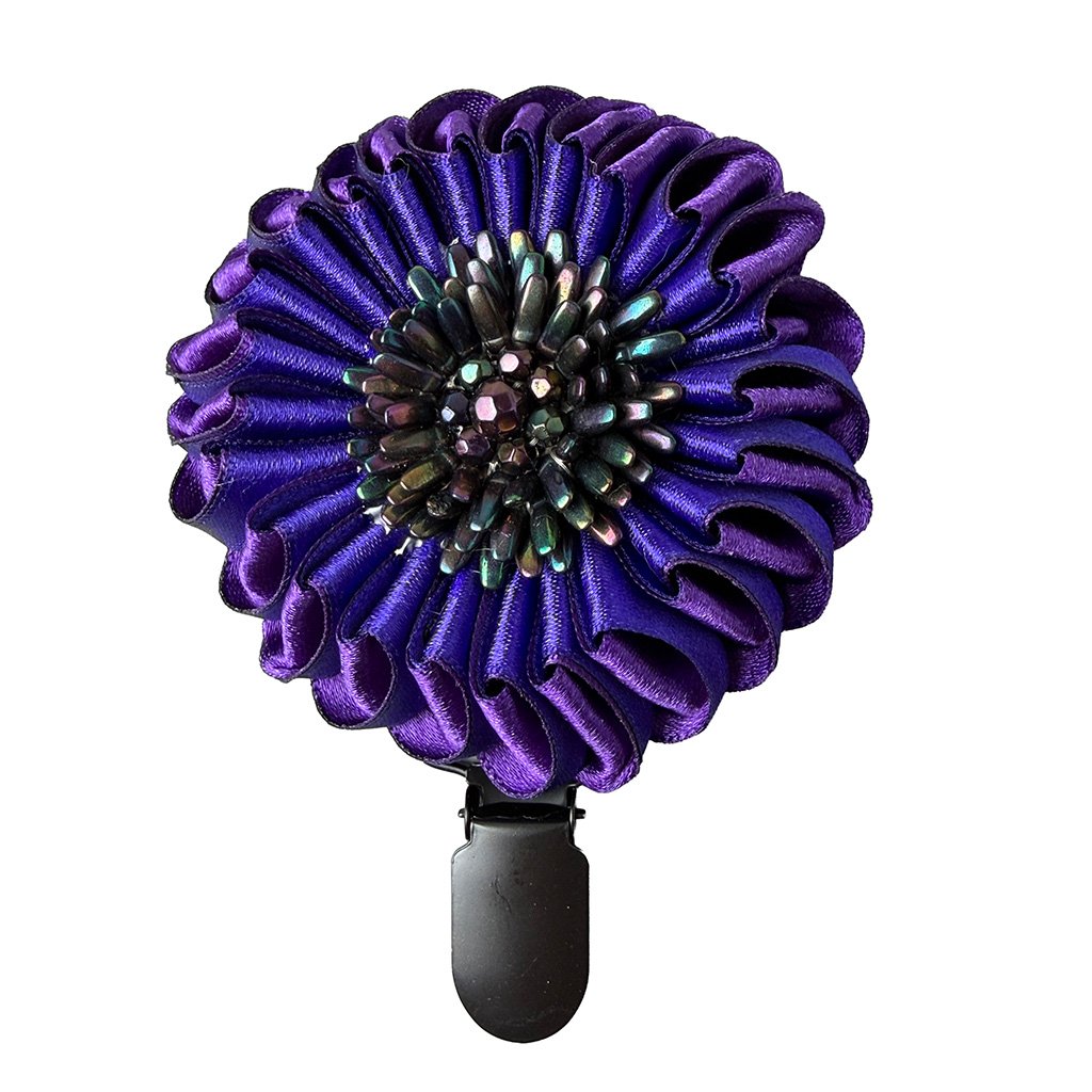 Elegant hand-sewn satin double-layer brooch with a glass bead decoration and suspenser clip for number. Fastening on a brooch pin at the back.