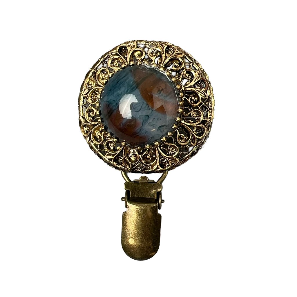 Starožitná secesní kulatá brož s vypouklým kabošonem, vytvořená původně ze skla a kovu, šperk je české tradiční výroby, původem přímo z Jablonecka, brož je upravena pro potřeby ve výstavním kruhu.