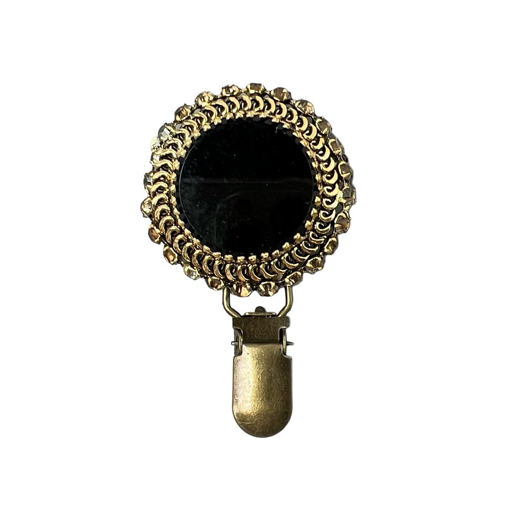 Starožitná kulatá brož s plochým kabošonem, vytvořená původně ze skla a kovu, šperk je pravděpodobně české tradiční výroby, původem přímo z Jablonecka, brož je upravena pro potřeby ve výstavním kruhu.